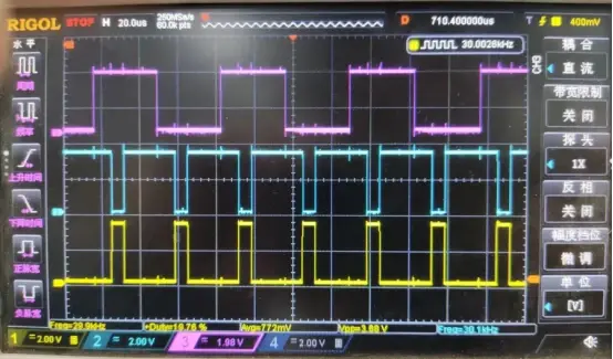上图中,黄线是PWM,蓝线为PWMN,紫线为测试引脚波形。可以看出,ADC 中断采样周期和 PWM 周期一致。