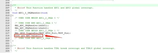 编写测试接口函数test_get_ADC_value,将其放到中断文件stm32g4xx_it.c中ADC1_2_IRQHandler处调用。