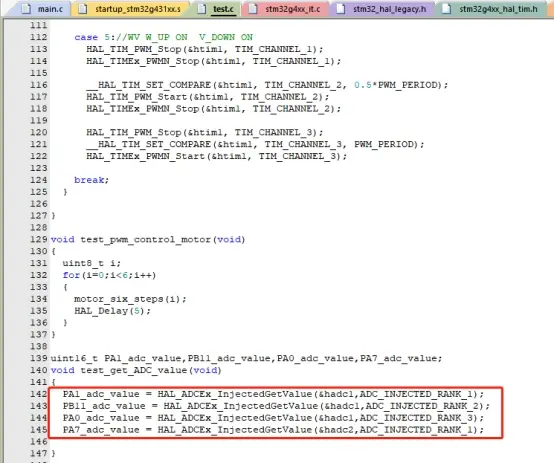 还是跟上一章节一样,做一个测试文件,将要测试的模块都在测试文件中实现,在主函数中调用需要测试的模块即可。在测试文件中添加test_PWM_ADC_init,主函数调用