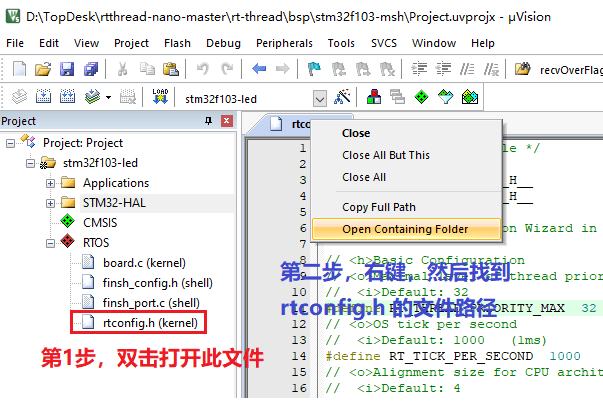 打开工程后,打开rtconfig.h的文件路径,把rtconfig.h复制到裸机工程中(如下图)。按这个方法,再把board.c复制到裸机工程中。