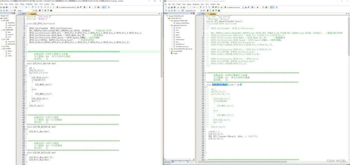void LCD_Writ_Bus(uint8_t dat): 此函数用于将8位数据通过SPI发送到LCD。先前使用的是位操作来手动发送数据,但现在改用HAL库函数HAL_SPI_Transmit来处理。