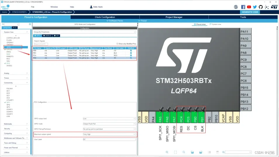 添加RES、DC、CS、BLK管脚。,管脚速率也修改为最快。