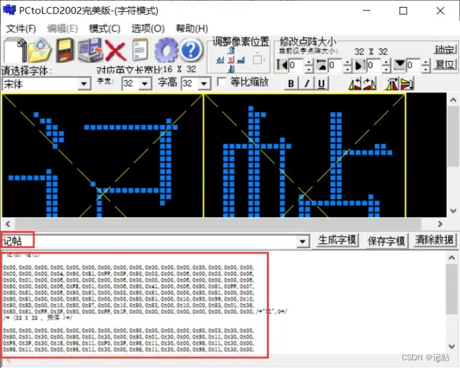 输入需要取模的汉字,这里设置大小为32*32.