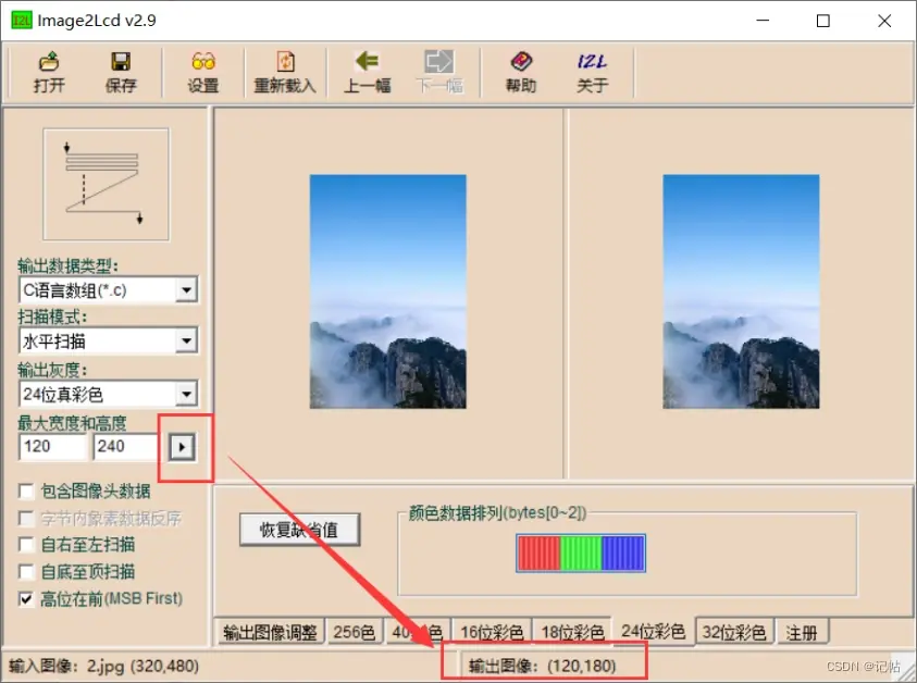 打开Img2Lcd软件,设置如下所示,需要注意的是24位真彩色。