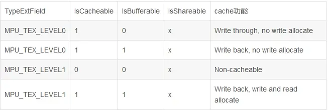 9.最后的4个参数需要一起看MPU_InitStruct.TypeExtField;MPU_InitStruct.IsShareable;MPU_InitStruct.IsCacheable;MPU_InitStruct.IsBufferable