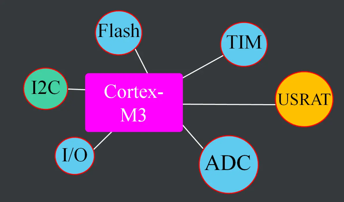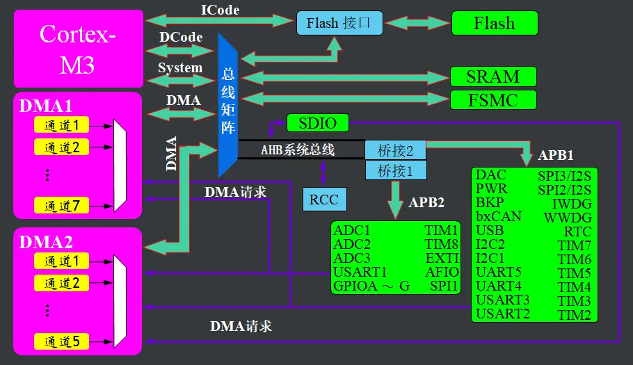这是一颗STM32单片机,它的系统由四个驱动单元和四个被动单元组成,四个驱动单元分别为Cortex-M3内核的数据总线和系统总线,它们是单片机的核心部分;两个DMA,也就是直接存储器访问单元,这两个单元与CUP内核有着同等的地位,它的作用就是在硬件上绕过CPU直接在内存与I/O设备之间开辟一条数据传输的通路,从而降低CPU开销,提高效率。