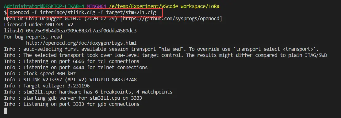 连接好 STLink和板子,如果板子的调试接口正常的话;然后在终端控制台里键入命令: 回车,得到以下信息,即搭建了一个 GDB Server,连通了硬件调试器和 GDB,通过 USB和硬件调试器连接,并且通过 TCP和 GDB连接: