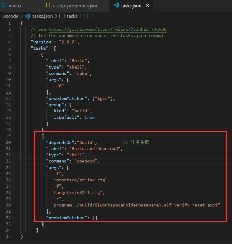当你能正确实现以上操作时,那么,关闭终端显示的窗口,使之退出搭建的 GDB Server链接;然后回到 tasks.json文件里,在原本的 “tasks” 任务标签里再追加以下内容: