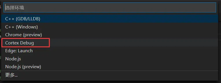 接着,如果根据上一篇安装了 Cortex Debug插件,就会出现如下选项(ps:如果窗口打开的是 .c文件或者 .h文件,只会显示前面两个选项,不知道是我电脑问题还是咋的,可以试着切换打开到 .json文件或者打开 makefile文件):