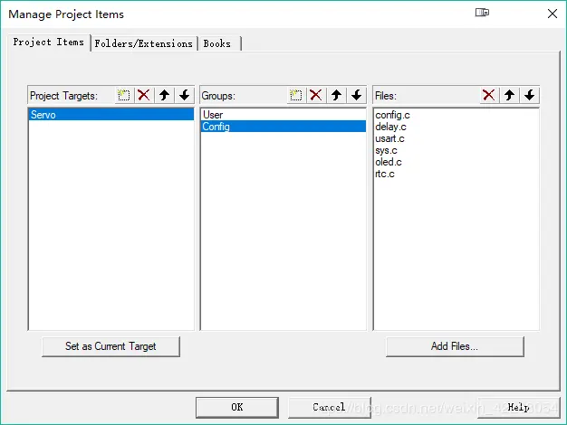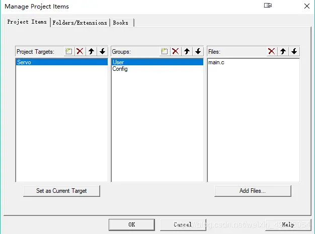 点击图标按钮2,打开Manage Project Items窗口,Groups和 Files如下设置: