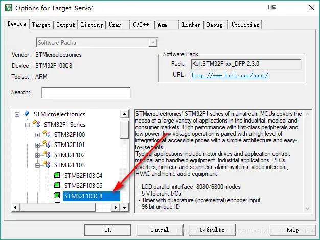 注意要安装Keil.STM32F1xx_DFP.2.3.0.pack支持包,因为我们要用STM32F103C8T6芯片的库函数编写。