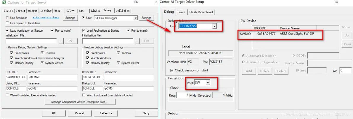 点击Setting,打开Cortex-M Target Driver Setup窗口,如果SWDIO里面未显示序列号,则电脑需要更新ST-LINK驱动。