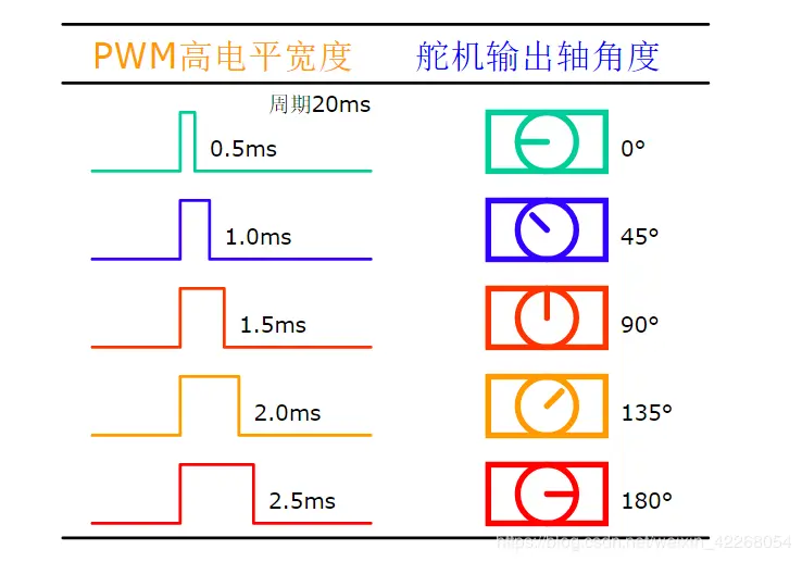 控制舵机的PWM:周期20ms,高电平时间0.5ms~2.5ms变化,可控制舵机0~180°的角度变化,即每个高电平时间都对应舵机的一个角度。但航模舵面的实际控制中,不可能有180°变化,所以通用的高电平宽度其实是1ms~2ms。
