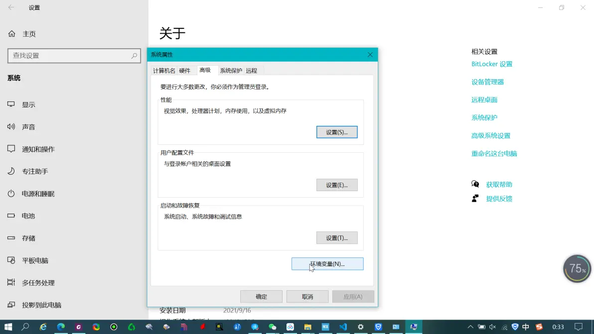 2、右键选择我的电脑—属性—高级系统设置—环境变量(每个人电脑都可能不一样,但可以肯定是一定在高级系统设置—环境变量下)。下面是我电脑上的。