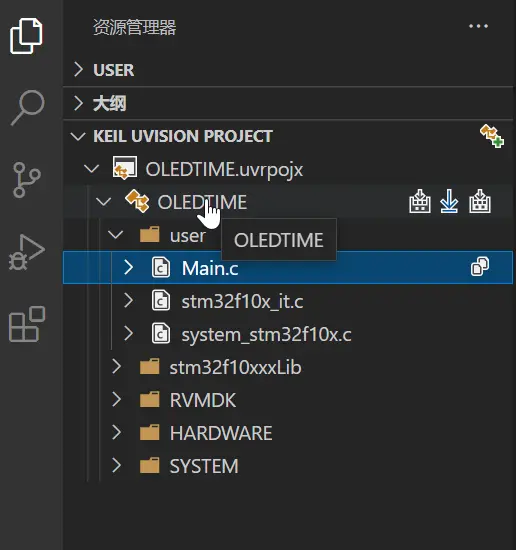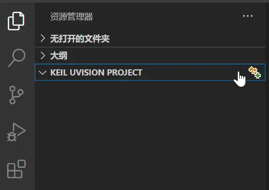 1、在资源管理器页面点击KEIL UVISION PROJECT 右侧的加号可以添加工程文件。