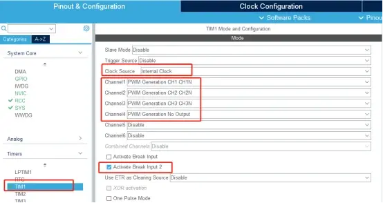 接下来是最重要的TIM1高级定时器的配置,高级定时器功能很强大,配置相对复杂,且需要针对对应的硬件去做配置。高级定时器主要用于产生6路互补的PWM来驱动MOS管,加入死区防止电源导通,使用刹车引脚。高级定时器1通道1、2、3用于产生6路互补的PWM,通道4用于后续的 ADC 电流采样。引脚配置与PWM极性请根据自己的硬件合理配置