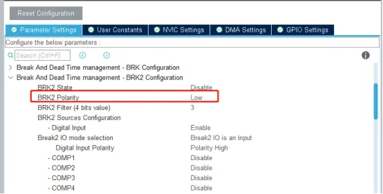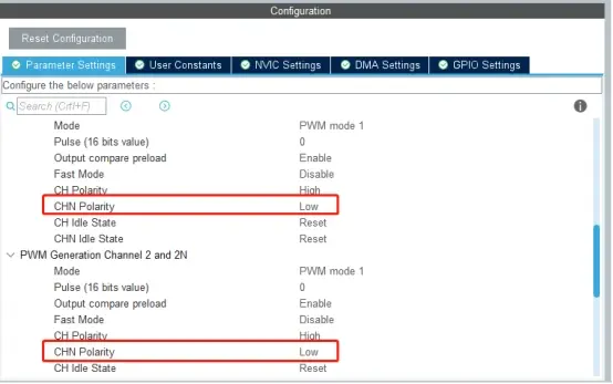 互补PWM极性配置,根据硬件选择,若上PMOS,下NMOS,极性相反 ,如果是上下桥都是NMOS,则需要将极性配置相同,否则上下桥MOS直接连通,电流很大会比较危险。