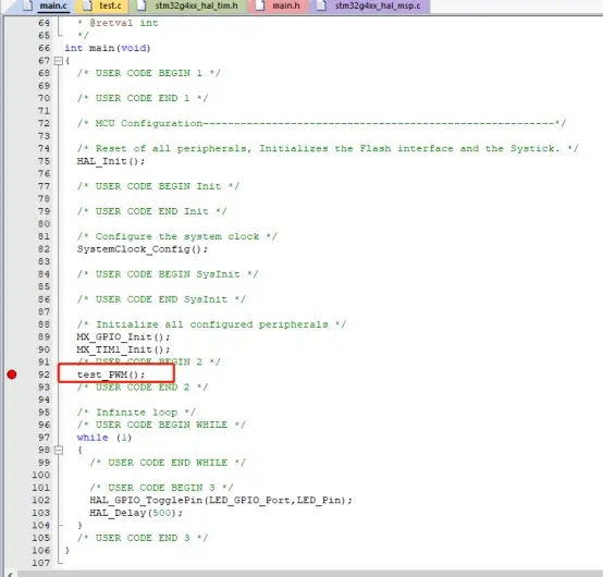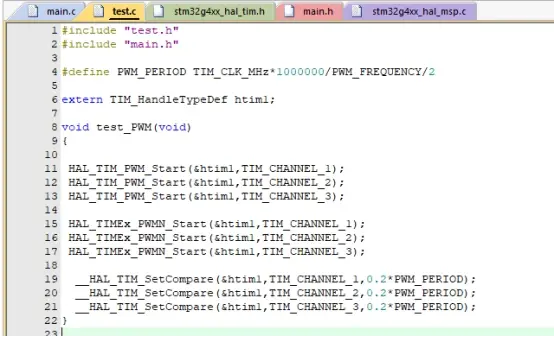 生成工程后,应首先对PWM模块进行测试,如果有示波器,先测PWM是否正常,死区时间是否正确。测试时,建议新建.c和.h的测试文件,将要测试的模块都在测试文件中实现,在主函数中调用需要测试的模块即可,这样可以避免后续频繁修改配置文件,导致代码丢失。