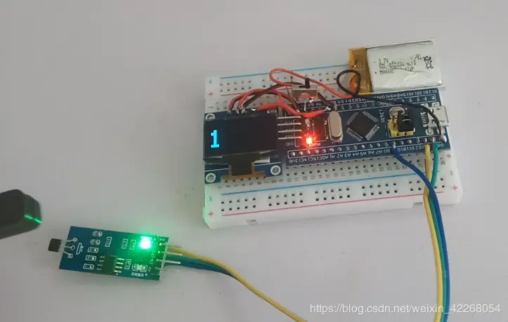 再加上简单的下降沿检测就可以用来计数了,为了将数字显示出来,我使用了一个oled屏幕,又添加了一点代码,但是由于屏幕这段代码执行的时间较长,会导致计数错误。所以我利用计时,让程序只在轮子停止转动时才刷新屏幕。