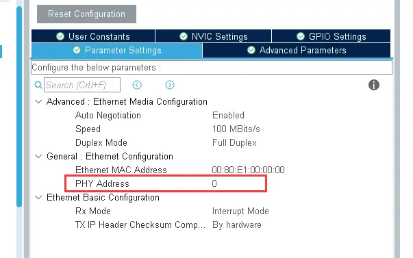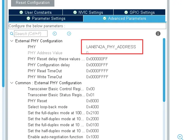 这里我PHY Adress根据实际IC硬件地址引脚修改。我也怀疑过是不是我硬件走线的问题导致,我测量了CLK的波形也正常,改低100M为10M也不行,就应该不是走线原因了。
