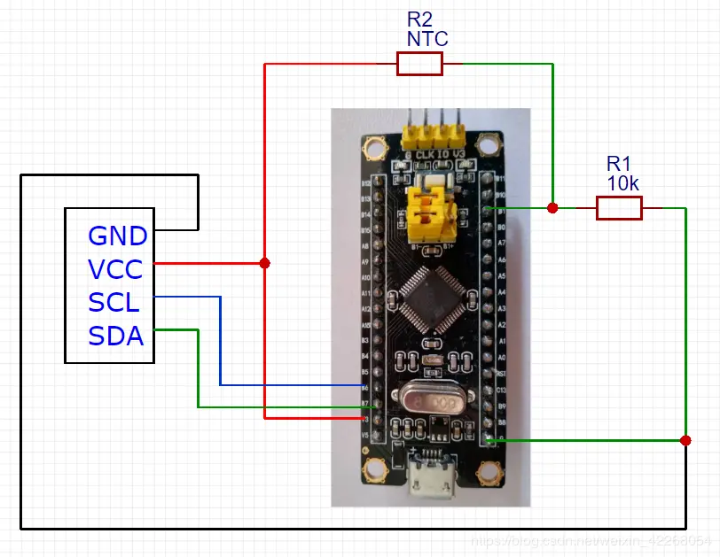 NTC热敏电阻连接电路:GND->10k电阻->PB1->NTC热敏电阻->3.3VOLED显示屏连接电路: * GND->GND * VCC->3.3V * SCL->PB6 * SCL->PB7