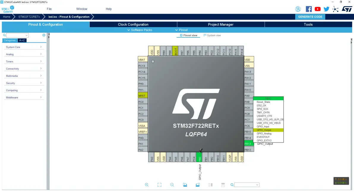 如果仅仅使用GPIO口执行输入输出的操作,那么RCC时钟,晶振,时钟树和中断都是可以不用配置使用默认的,建立工程后左键点击需要打开的IO口后选择GPIO_OUTPUT或GPIO_INPUT。