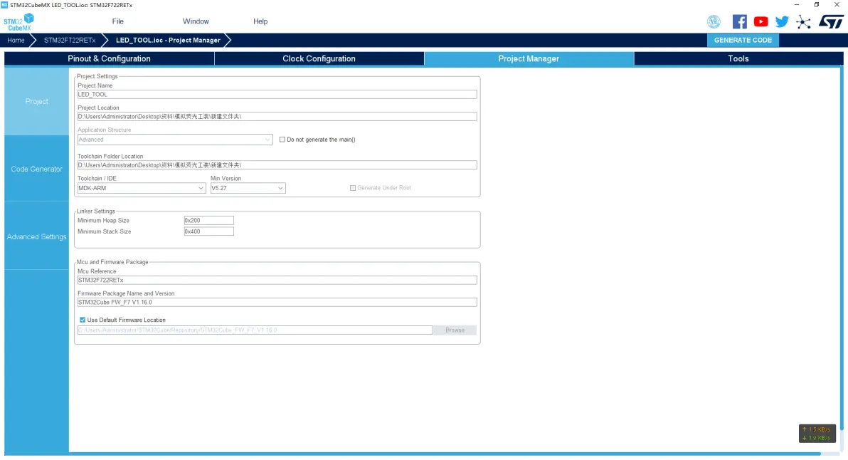 点击Project Manager页面,输入工程名和工程位置,选择工具链和IDE为MDK-ARM,版本为5.27;