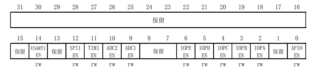 图1为外设时钟使能寄存器(RCC_APB2ENR)的位描述