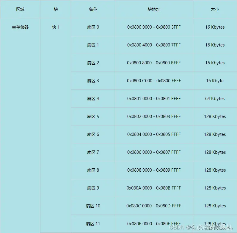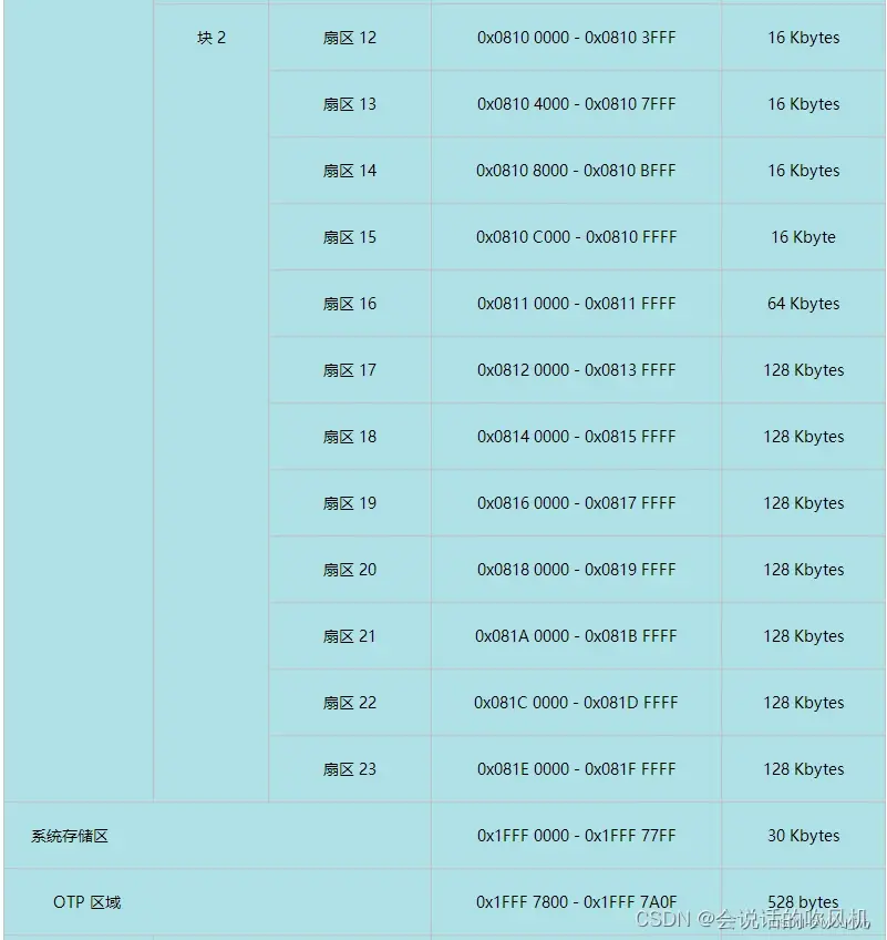 STM32 的内部 FLASH 包含主存储器、系统存储器、 OTP 区域以及选项字节区域,它们的地址分布及大小下表: