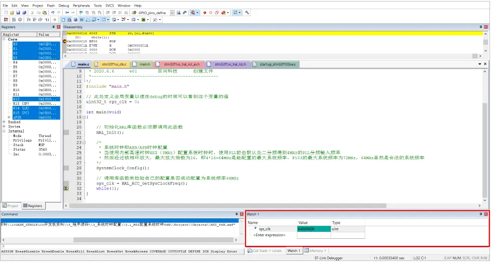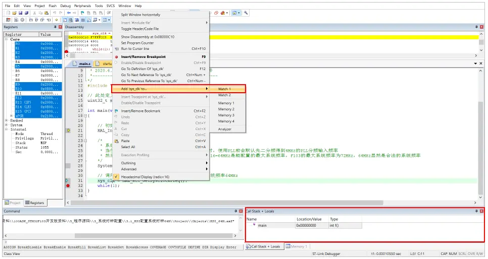 本实验对应配套资料的“5_程序源码3_基础重点—时钟系统”下的“3.1_HSI配置系统时钟64M”和“3.2_HSE配置系统时钟72M”。打开工程后,参考前面“4.4 下载程序和调试”进入调试模式,在代码中找到“sys_clk”选中,右键选择“Add ‘sys_clk’ to …”->“Watch 1”,即可在右下角显示该变量查看窗口,可以看到当前“sys_clk”为0,如图 9.4.1 所示。