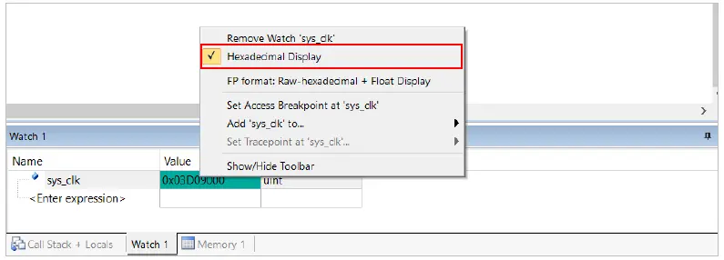 在“while(1);”处加上断点,运行程序,可以看到“sys_clk”分别为64000000和72000000,如图 9.4.3 和图 9.4.4 所示,与代码设计吻合。如果显示16进制,可选中该数字,右键去掉勾选“Hexadecimal Dispaly”,如图 9.4.2 所示。