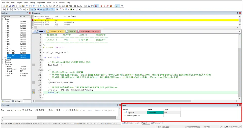 主函数里调用HAL库提供的“HAL_RCC_GetSysClockFreq()”函数获取系统时钟验证。