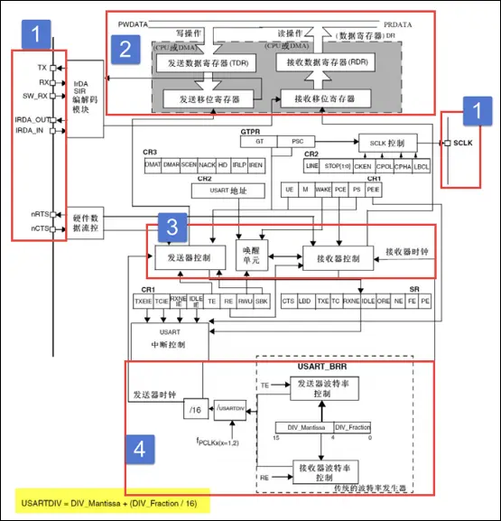 USART有专门控制发送的发送器、控制接收的接收器,还有唤醒单元、中断控制等。