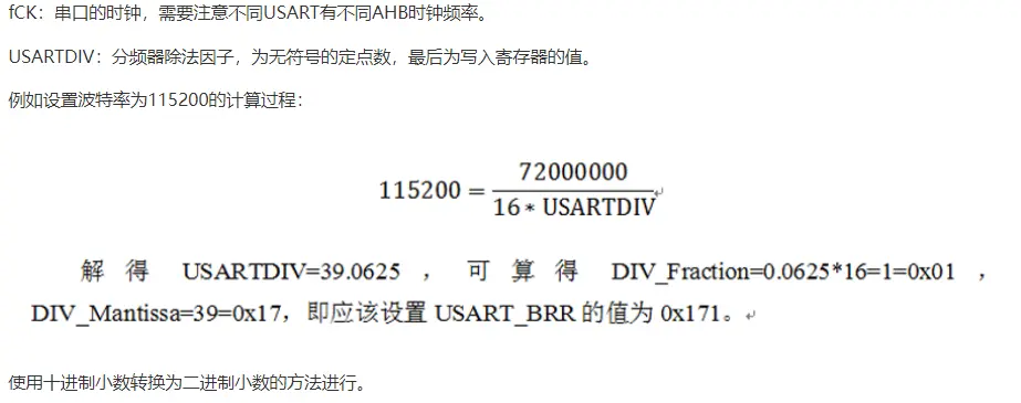 通过波特率寄存器(USART_BRR)可设置波特率。由于计算出的分频因子有小数,因此寄存器分为两个部分: