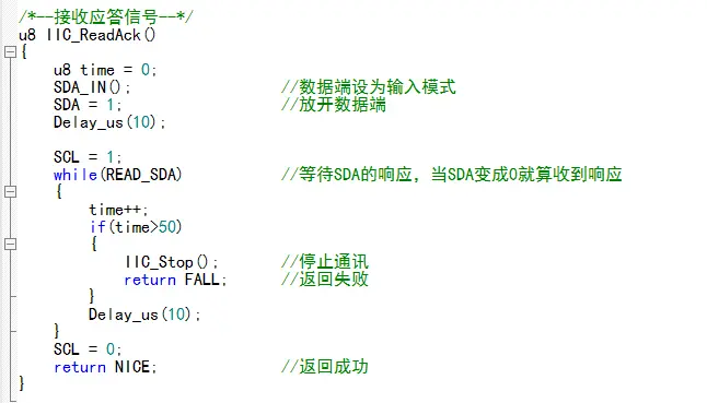 每次写完数据都要接收一次 “应答信号” ,把SDA改为输入模式并置1,等待,SCL置1,如果这时SDA收到0就算收到应答。
