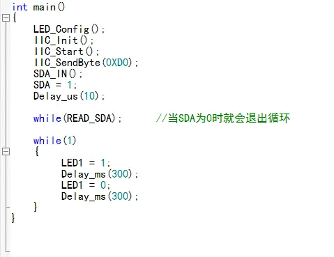 如果通讯成功了,LED就会闪烁,如果LED不闪烁,就检查芯片地址对不对,AD0引脚和芯片地址是否相符,通讯程序是否正确,每次延时给得够不够。