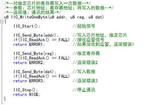 发起起始信号;写入芯片地址,接收应答,写入寄存器地址,接收,写入数据,接收应答,停止通讯,返回"NICE",每次接收应答的失败都会导致通讯停止。
