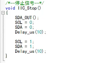每次通讯的最后一定是停止信号;把SDA设为输出模式,SCL置0,SDA置0,等待,SCL先置1,SDA再置1,等待。