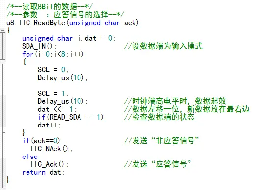 读取一次数据;先设SDA为输入模式,把SCL设为0,等待,把SCL设为1,等待,数据左移1位,把SDA的状态放到数据的最低位,循环八次,最后发送应答。