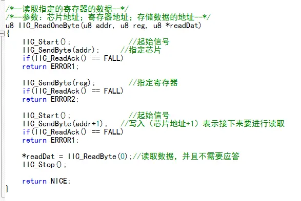 读取芯片的单个数据;发起起始信号,写入芯片地址,写入寄存器,发起起始信号,写入(芯片地址+1)表示读取,读取数据,并选择“非应答信号”,停止通讯,返回“NICE”表示成功。