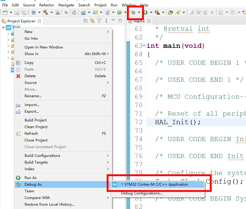 在STM32CubeIDE中,选中工程的情况下,也可以在工程上右键点击如图红框所示选项或者菜单栏上的按钮进入调试状态。