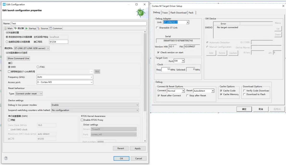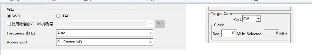 接口和频率选择,现在搞STM32一般都使用三线的SWD,特别是ST-Link OB,JLink OB出现后,方便、小巧,板子上也只需要留出SWDIO、SWCLK和GND三根线就行,很难看见JTAG口了。如果板子调试线过长或者干扰太大,可以尝试降低频率提高通信成功率。