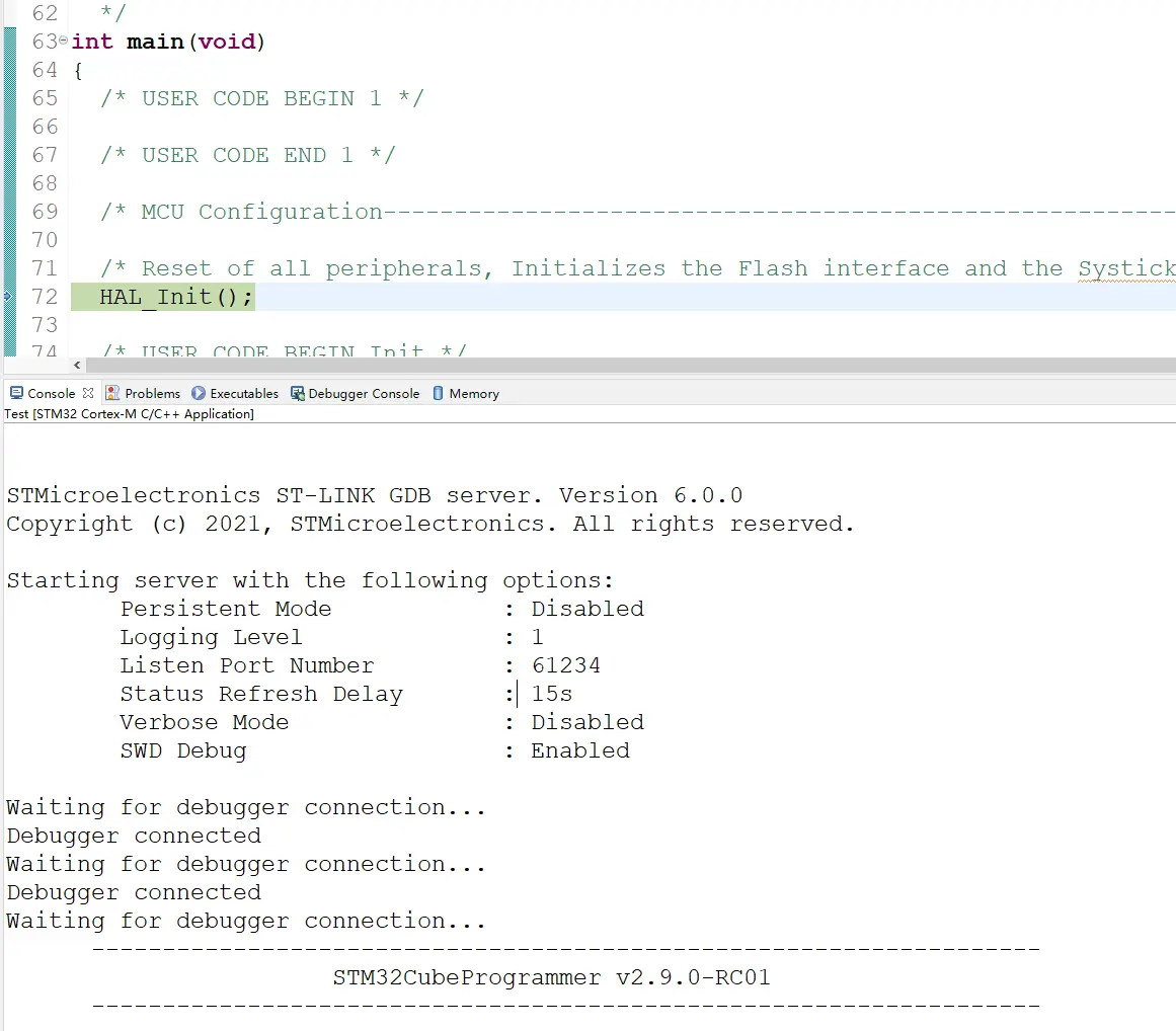 点击Debug按钮进入调试,此时如果连接正确的情况下控制台会弹出若干信息,接着将程序停到main函数第一行。