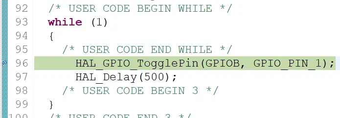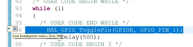 打断点和Keil一样,在程序左侧双击,程序就会运行到断点处停止。
