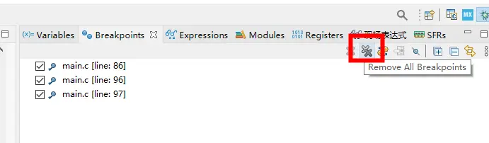 如果有很多个断点需要删除,就可以通过调试界面右侧进行全部删除。
