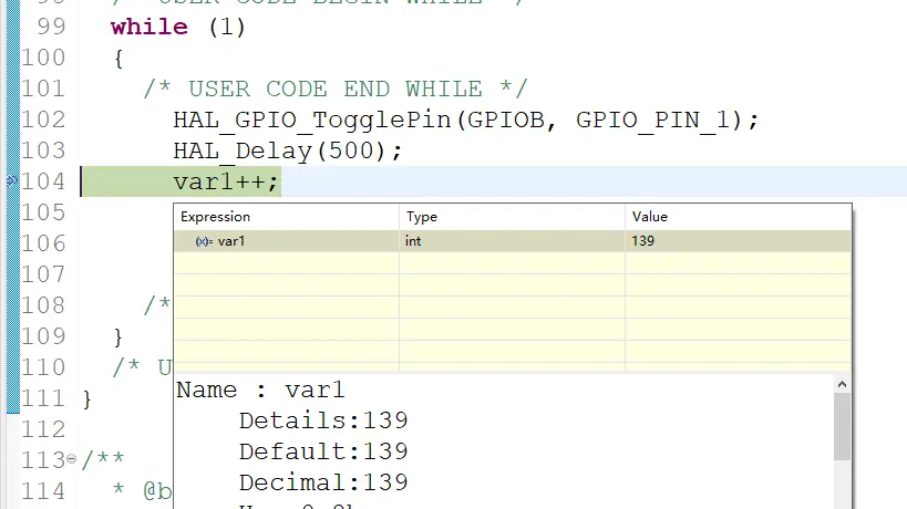 在程序中定义了三个变量,分别为全局变量、静态变量和局部变量。并在主函数中让其自增,用来说明STM32CubeIDE中的查看变量功能。