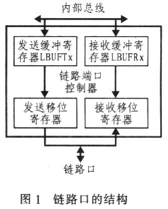 TSl01的每个链路口由发送器和接收器两部分组成,每部分都有128 bit的移位寄存器和128 bit的缓冲寄存器,其结构如图l所示。每个链路口均有8 bit数据线和LxCLKIN、LxCLKOUT和LxDIR(x为链路口序号0-3)3个控制引脚,可支持多片TSl01处理器间点对点的双向数据传送,也可以用于与外部设备进行数据传输。其中LxDIR用来指示链路口的数据流向。LxCLKIN和LxCLKOUT为链路口的时钟/确认握手信号。发送数据时,LxCLKOUT为时钟信号,LxCLKIN为确认信号;接收数据时,LxCLKIN为时钟信号,LxCLKOUT为确认信号。发送数据时,首先传输4字数据到链路发送缓冲寄存器LBUFTx,再将其复制到移位寄存器(若移位寄存器为空,此时LBUFTx可被写入新的数据),然后以字节的形式发送(先发送低字节),每个字节在链路时钟的上升沿和下降沿被驱动和锁存。接收器的移位寄存器为空时,系统将开始接收发送方传输的数据并将其送入移位寄存器,同时驱动LxCLKOUT为低电平。当整个4字接收完毕后,如果接收缓冲寄存器LBUFRx为空,系统会将4字数据从移位寄存器复制到LBUFRx,并在数据被复制后驱动其Lx-CLKOUT为高电平,以告诉发送方接收缓冲寄存器为空,可以准备接收新数据。发送方检测到Lx-CLKIN为高电平后立即进行下次传输。
