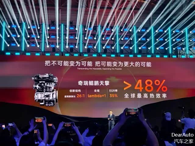 在10月18日的全球创新大会上,热效率高达48%的鲲鹏天擎发动机再次展出,奇瑞执行副总裁、CTO 高新华表示:“鲲鹏动力热效率突破48%,中国的发动机技术能成为全球第一。”