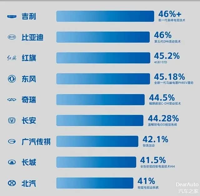其实,不仅仅是奇瑞,吉利、比亚迪发动机46%的热效率也击败了丰田、本田,红旗、东风发动机的热效率都超过45%。