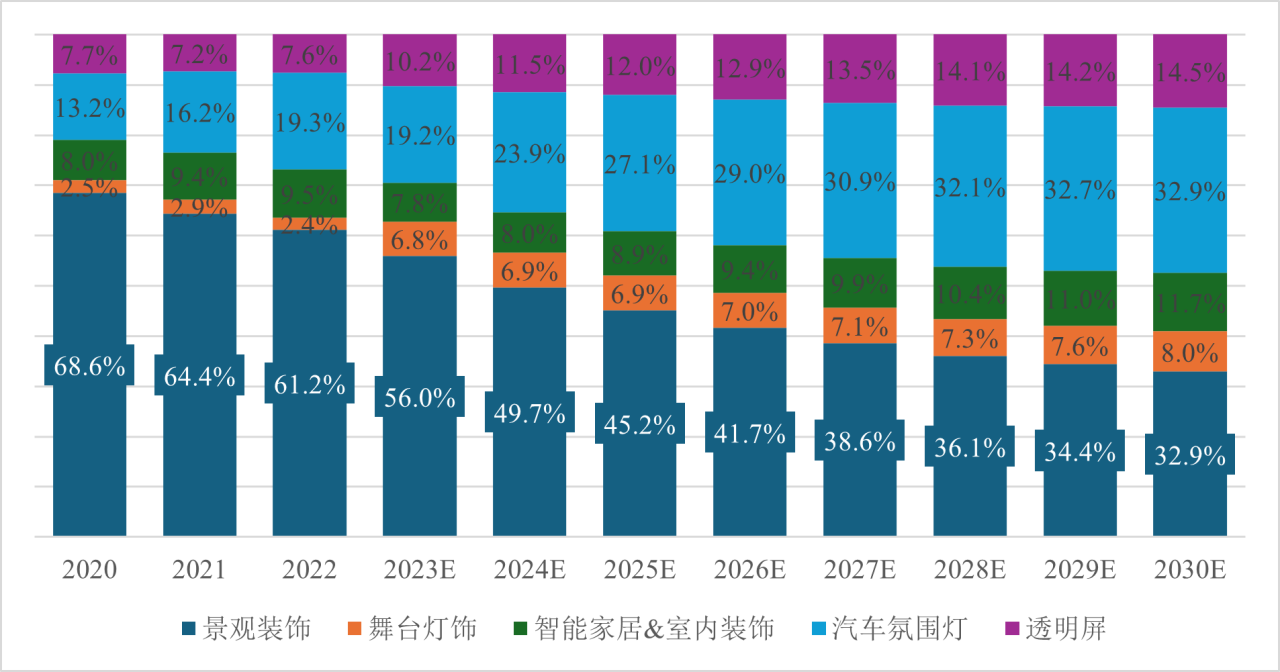 从市场结构看,景观灯饰、舞台灯饰、智能家居及室内装饰、汽车氛围灯、透明屏是LED幻彩行业的主要应用场景。当前景观灯饰是幻彩领域的主要应用场景,2023年市场规模达79.1亿元,占56.0%。未来,房地产行业下行、绿色节能等因素将对景观灯饰带来一定不利影响,增速将有所放缓,预计到2030年,LED幻彩应用结构将出现显著变化,汽车氛围灯、透明屏、智能家居及室内装饰,以及舞台灯饰市场是未来主要的增量。